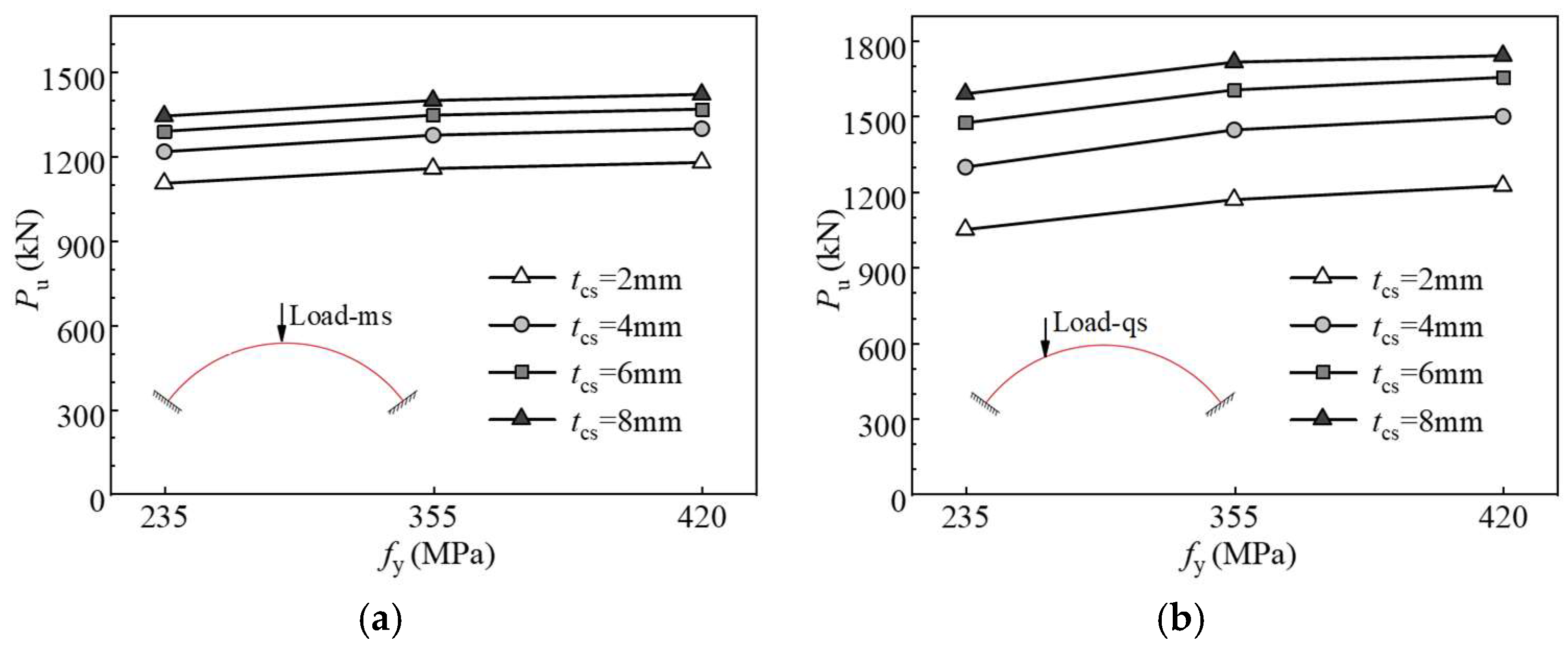 4.3.2. Influence of Corrugated Steel Strength and Thickness