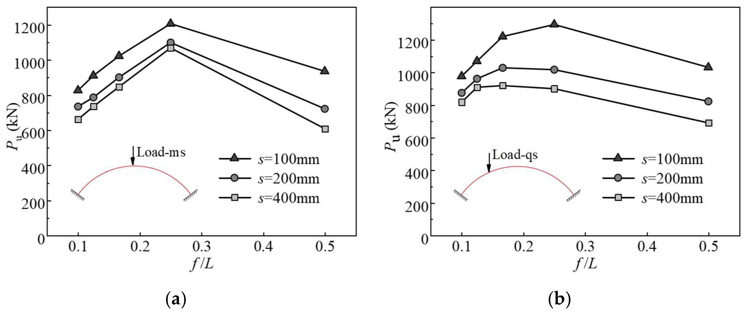 - Compared to mid-span loading, the shear capacity under quarter-point loading exhibits a higher sensitivity to variations in shear connector spacing and corrugated steel thickness. This behavior occurs because CSC arches under quarter-point loading are primarily bending-dominated. Changes in corrugated steel thickness and shear connector spacing significantly alter the flexural stiffness of the structure.