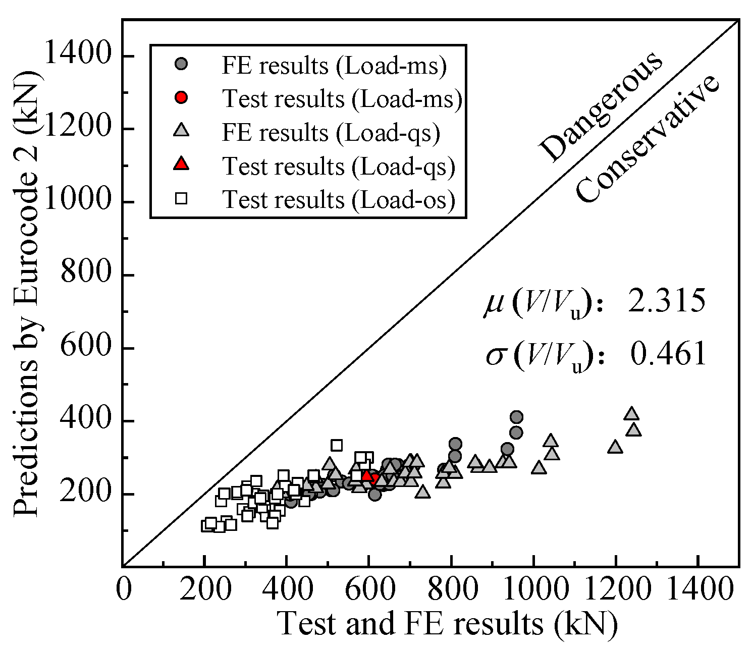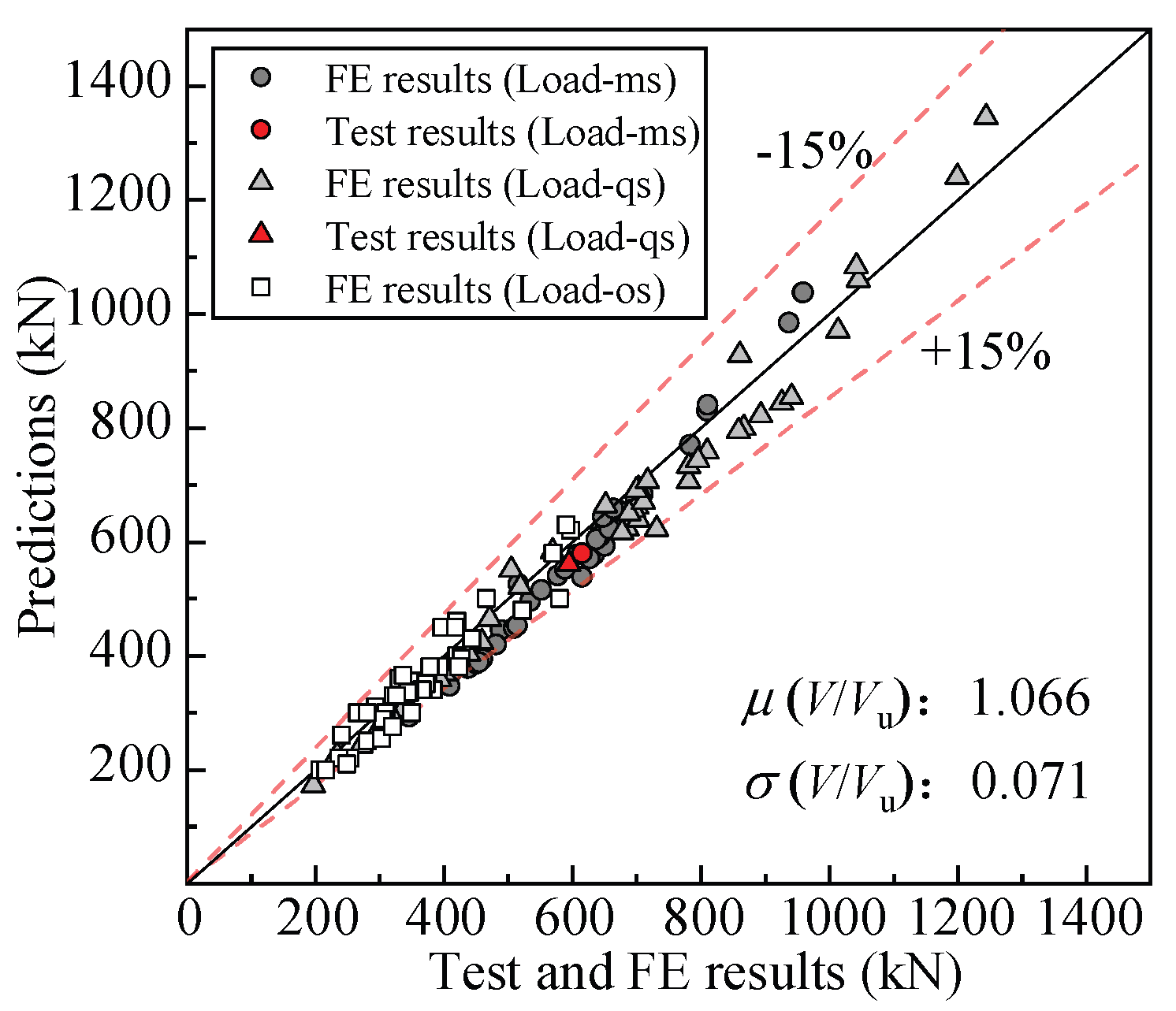 - Validation against results from tests and numerical simulation cases reveals that the predictive model incorporating shear–compression ratio in this study achieves excellent agreement with actual shear bearing capacities, with a mean value (μ) of 1.066 and a corresponding standard deviation (σ) of 0.071. The relative error is consistently within 15%.