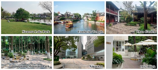 Among China’s urban construction land, park green spaces, squares, and streets are the three most open and accessible urban spaces, closely intertwined with citizens’ daily lives and easily quantifiable. Hence, they constitute the primary sample types for this study. Park green spaces, as defined by the Urban Green Space Classification Standard (CJJ/T85-2017) [] in China, represent a substantial category of green spaces within designated construction areas, essentially functioning as urban parks. Squares fall into two categories: (1) square green spaces, as outlined in the Urban Green Space Classification Standard (CJJ/T85-2002) [] and (2) small squares formed by the setback of public buildings along streets, which, after landscaping and beautification, serve basic recreational and seating functions. Streets refer to commercial pedestrian streets, historical districts, old streets, and open residential communities that are not enclosed.