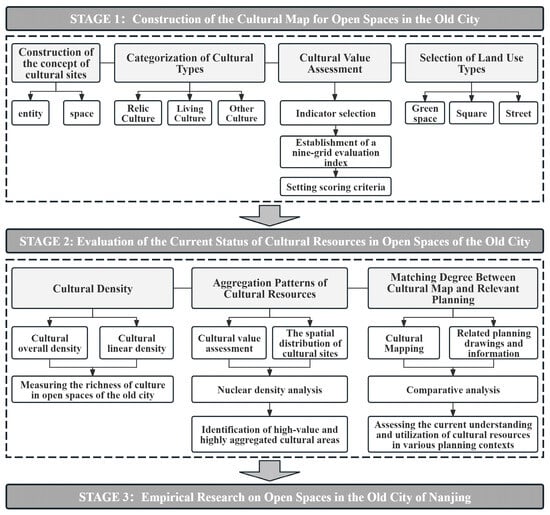 This study employed a hybrid methodology integrating cultural mapping and quantitative evaluation to holistically assess cultural resources within Nanjing’s old urban open spaces (Figure 3). First, we classified the culture of the old urban open spaces as relic, living, or other culture. This provided the foundation for the study. Then, we constructed the cultural map using cultural categories, cultural value scores, and land-use types as coordinates for cultural sites. Utilizing the information from the cultural map, we quantitatively evaluated the current state of cultural resources in Nanjing’s old urban open spaces considering three aspects: cultural density, cultural resource aggregation patterns, and matching degree between cultural maps and related planning. The goal was to reveal the cultural patterns of old urban open spaces and provide a scientific basis for the protection and planning of urban culture. While creating the cultural map and evaluating the current cultural resources, we followed two fundamental principles. First, we examined the relationship between culture and community. Second, we examined the relationship between culture and the old city’s spatial structure.