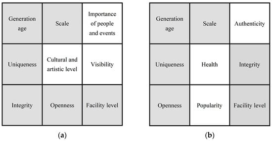 We designed the nine-rectangle-grid evaluation index of open space culture according to the characteristics of different types of culture. Both heritage (Figure 4a) and living (Figure 4b) cultural sites were assessed using the following indicators: generation age, scale, uniqueness, integrity, openness, and facility level. In addition, heritage sites were assessed using the importance of people and events, cultural and artistic level, and visibility. The assessment of living cultural sites also included authenticity, health, and popularity. Other cultural sites were evaluated based on five indicators: integrity, openness, facility level, generation age and scale. Every indicator is evaluated on a 5-point scale (Table 2). Popularity is determined by on-site questionnaires. The questionnaire procedure received formal academic review approval, and verbal informed consent was obtained from all participants. The cultural evaluation score for each site was calculated as the arithmetic mean of all indicator scores, based on the premise that all indicators contribute equally to cultural value. To ensure consistency and minimize subjectivity, ten researchers independently performed scoring following a back-to-back procedure, followed by cross-checking and collaborative resolution of discrepancies.