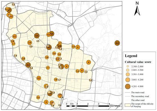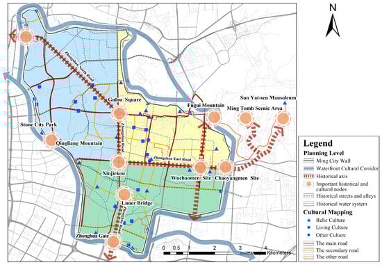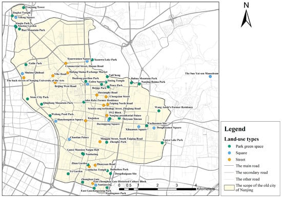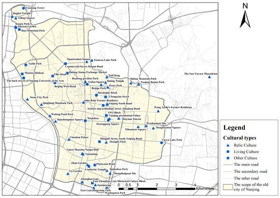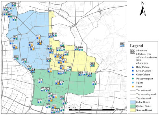 Based on these results, the “cultural information sheet” formed by the cultural types, cultural value scores, land-use types (Figure 7) and spatial locations are placed on the base map, resulting in the cultural map of open spaces in Nanjing’s old city (Figure 8).