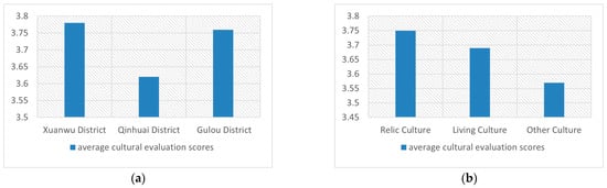 Comparison of cultural evaluation scores in Nanjing’s old city. (a) By administrative district; (b) by cultural type.