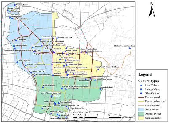 The open spaces with cultural resources in the old city were classified as relic, living, and other cultures. They were marked on the base map, resulting in the cultural map of open spaces in Nanjing’s old city (Figure 5). According to Figure 6, 18 cultural sites are distributed in Xuanwu District, 22 in Qinhuai District, and 19 in Gulou District. One site spans two districts and was classified according to the district in which most of its area lies. 52 samples with relic or living culture were collected, including 16 samples in Xuanwu District, 21 in Qinhuai District, and 15 in Gulou District. 36 sites are relic culture sites, such as the Nanjing Presidential Palace, Jiming Temple, and Zhanyuan Garden. There are 16 living cultural sites, including Xinjiekou, Confucius Temple, and East Zhonghua Gate Historical Culture Block. 7 are considered other culture sites, such as Yuejiang Tower, Daxing Palace Square, and Yueya Lake Park. Among these 59 cultural sites, 33 are park green spaces, 11 are squares, and 15 are streets.