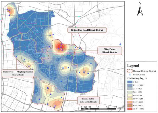 Kernel density analysis, combined with cultural value scores, revealed the aggregation patterns of cultural value in Nanjing’s old city. Compared to living and other cultural sites, heritage cultural sites dominated in terms of quantity and distribution range. This formed a network of relic culture in the old city. The spatial distribution of relic culture exhibited a significant clustering pattern with uneven spatial distribution (Figure 11a). It was sparse in the northwest and southeast and dense in the southwest and northeast. A high-density cluster was formed around Beijige Park, Jiming Temple, and Heping Park. This area is therefore a comprehensive “hotspot” with concentrated and high-value heritage cultural resources in Nanjing’s old city. In the northwest, areas such as Yuejiang Tower, Gan Xi’s former residence in the south, Changxiang Park in the east, and the Wuchao Gate ruins in the east show moderate clustering with a point-based distribution. They exhibit a linear distribution trend from the south to the northwest and northeast. The results revealed the continuity and networked characteristics of the number and value of relic culture in Nanjing’s old urban open spaces. Thus, these heritage sites are not isolated but interconnected through spatial links, forming a relatively organic cultural ecosystem.
