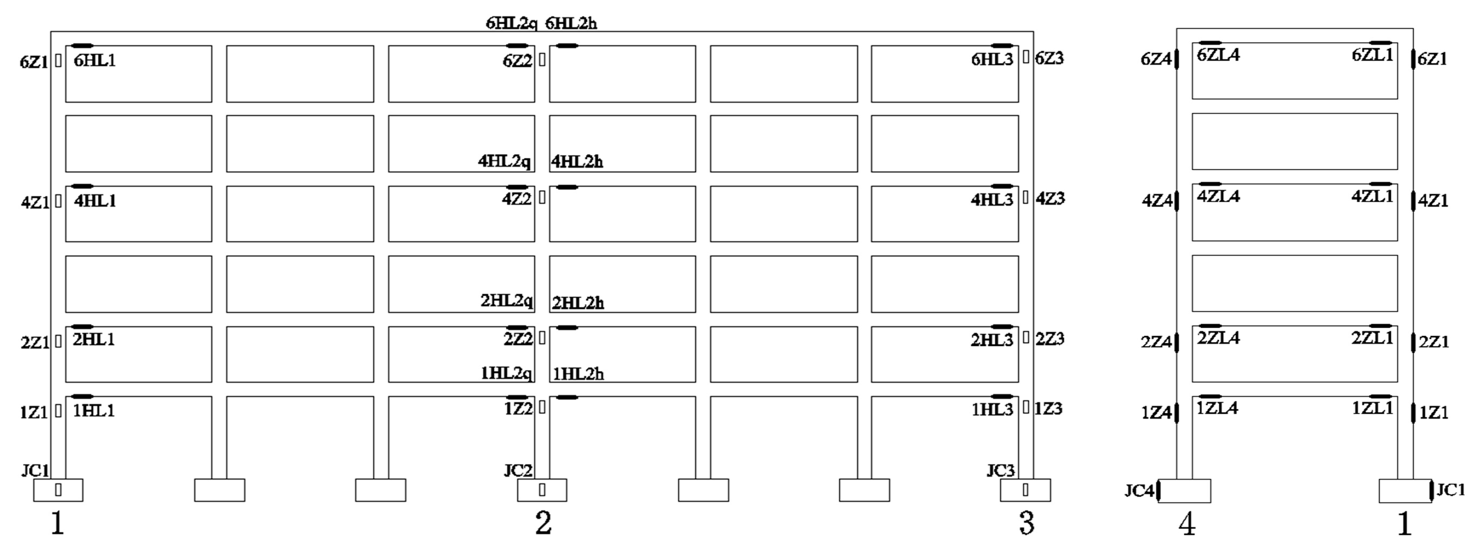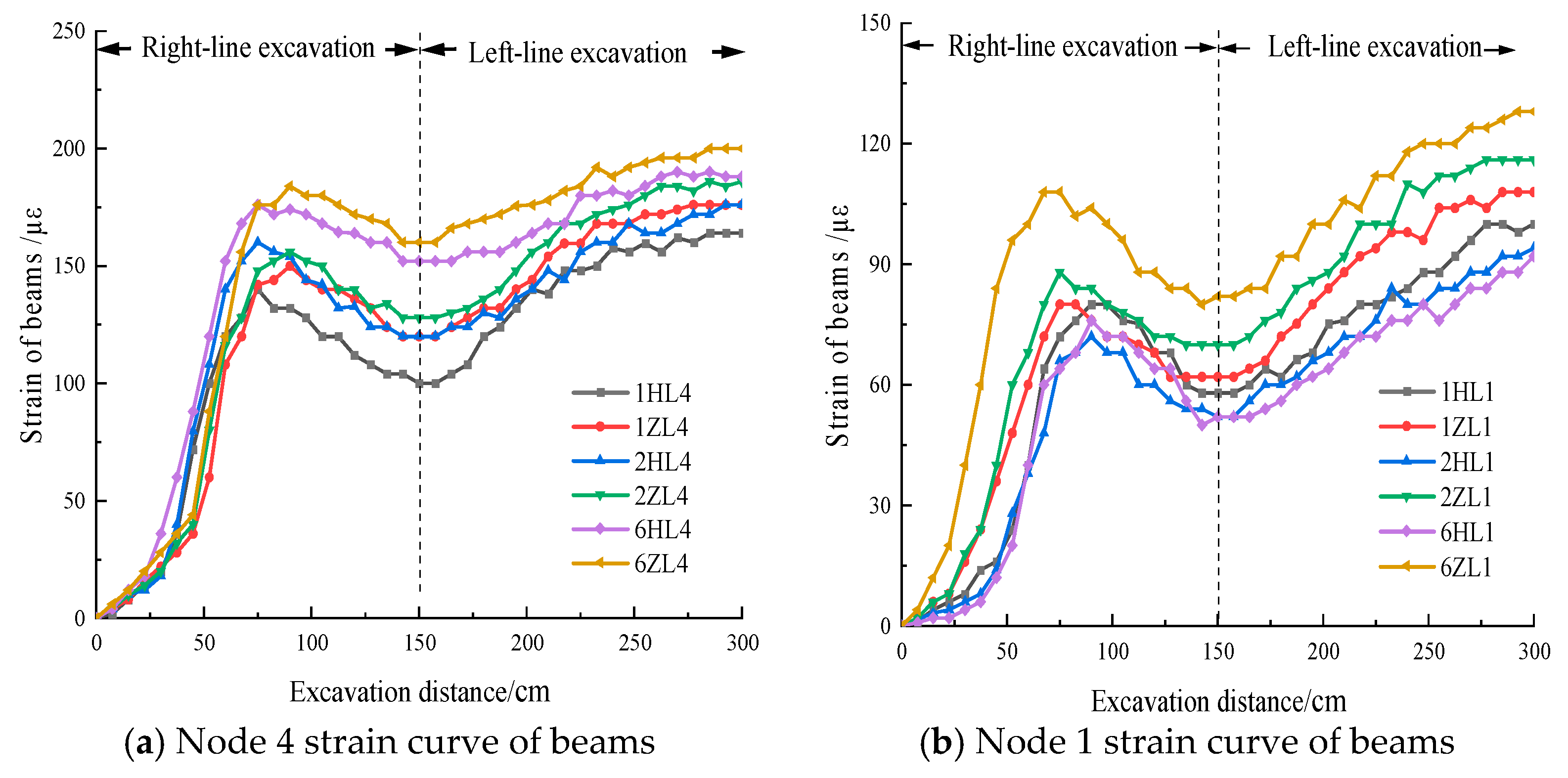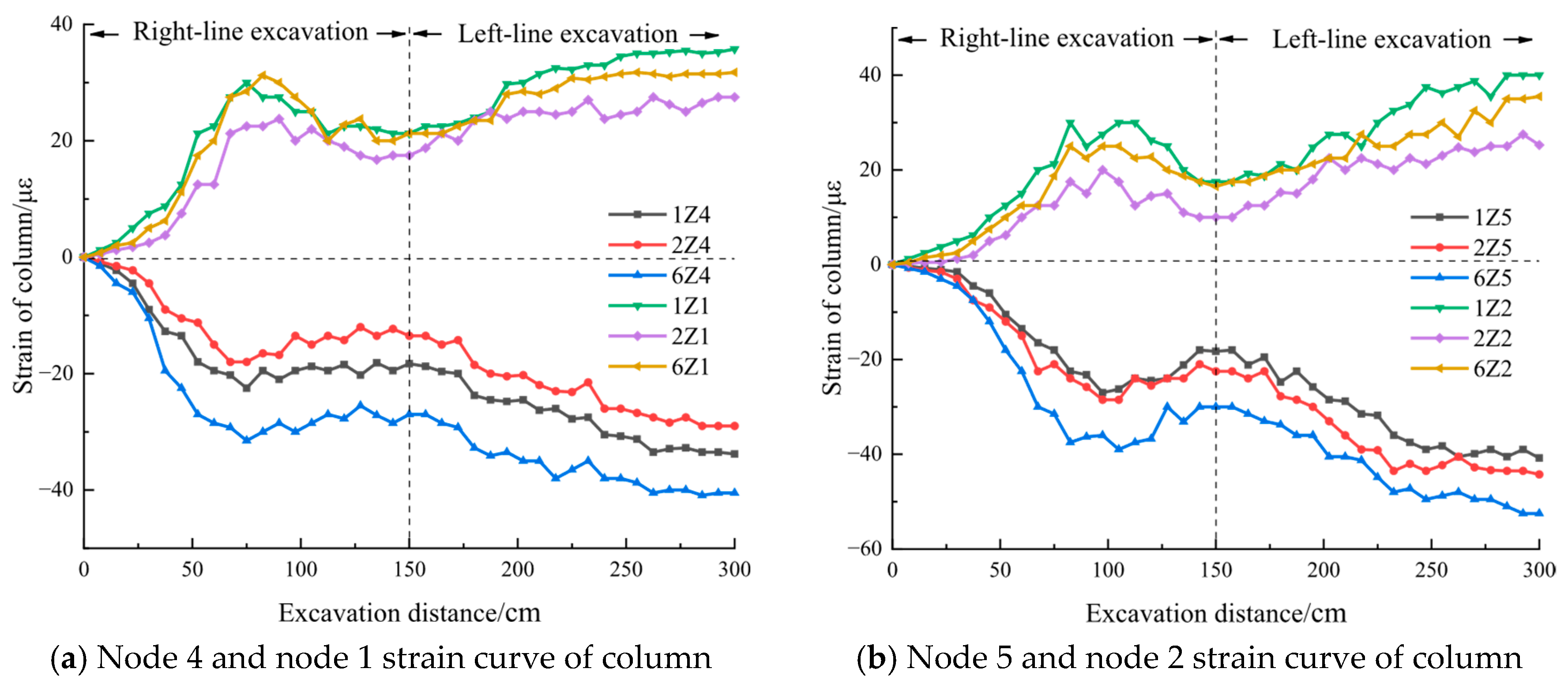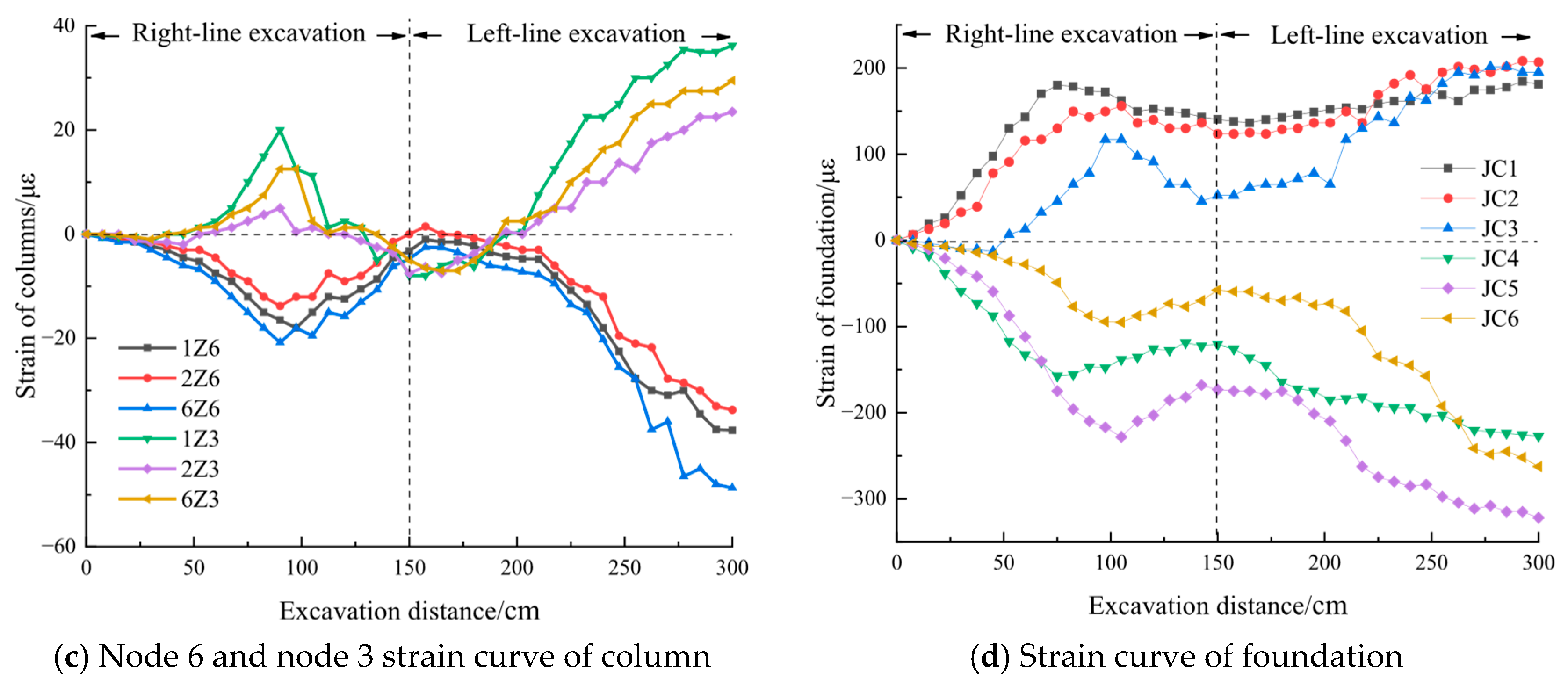 - The strain patterns of the building’s frame columns, beams, and foundation align with the settlement patterns. On the fractured zone side, compression occurs at the foundation and outer columns, while tension is observed on the opposite side. Strain values are influenced by factors such as load distribution, fractured zone position, and strata settlement, resulting in complex strain variations in the building’s components.