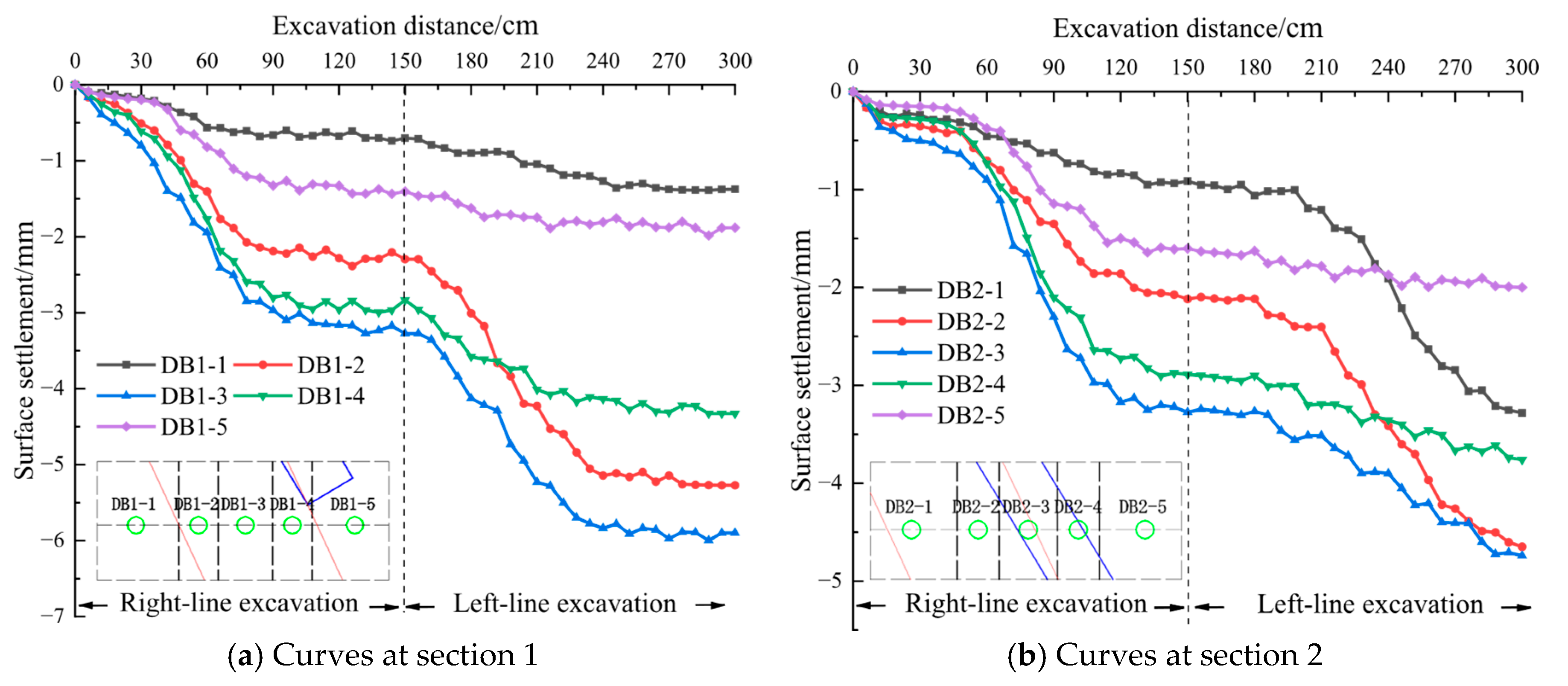 - Fang, Q.; Du, J.-M.; Li, J.-Y.; Zhang, D.-L.; Cao, L.-Q. Settlement characteristics of large-diameter shield excavation below existing subway in close vicinity. J. Cent. South Univ. 2021, 28, 882–897. [Google Scholar] [CrossRef]