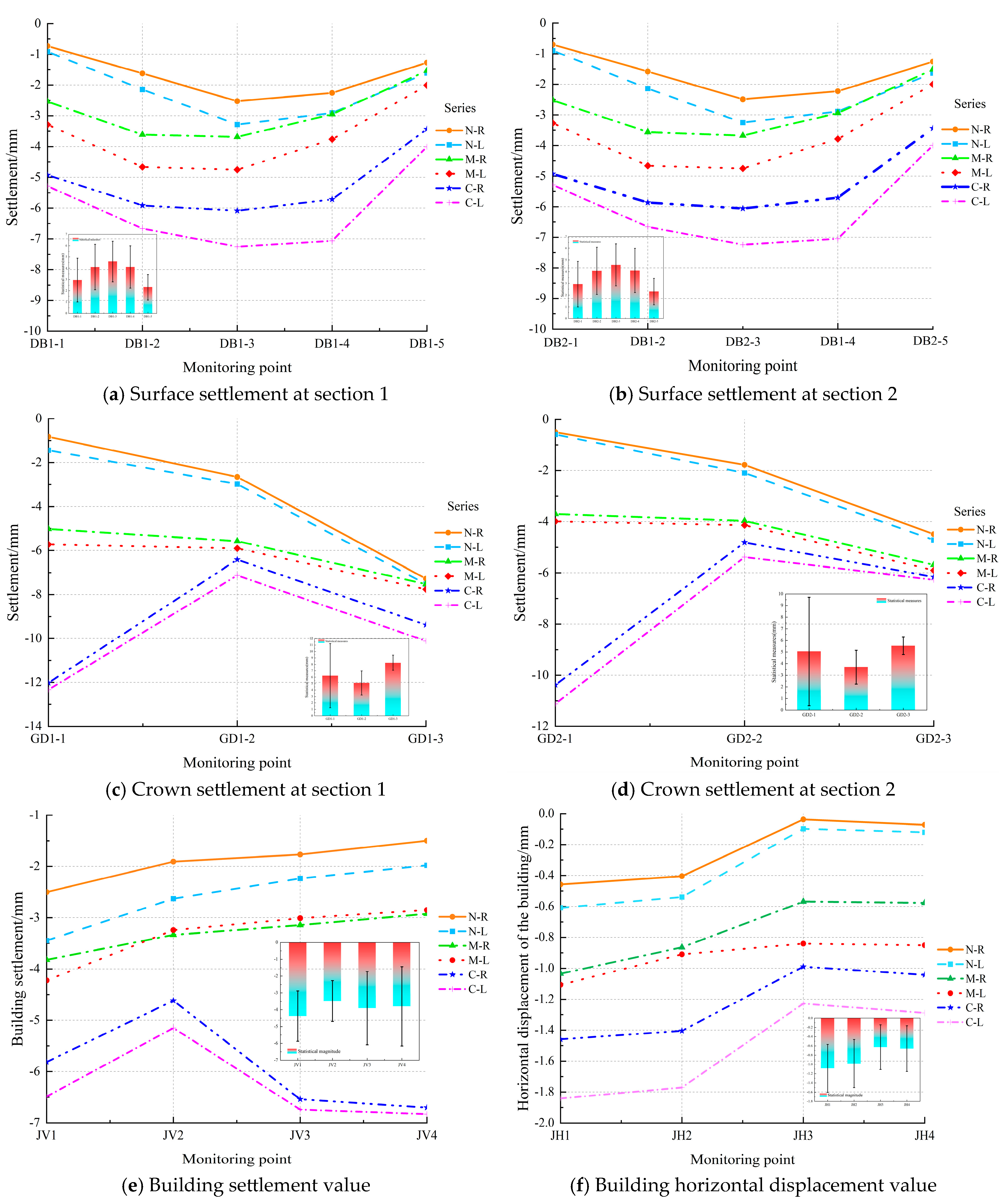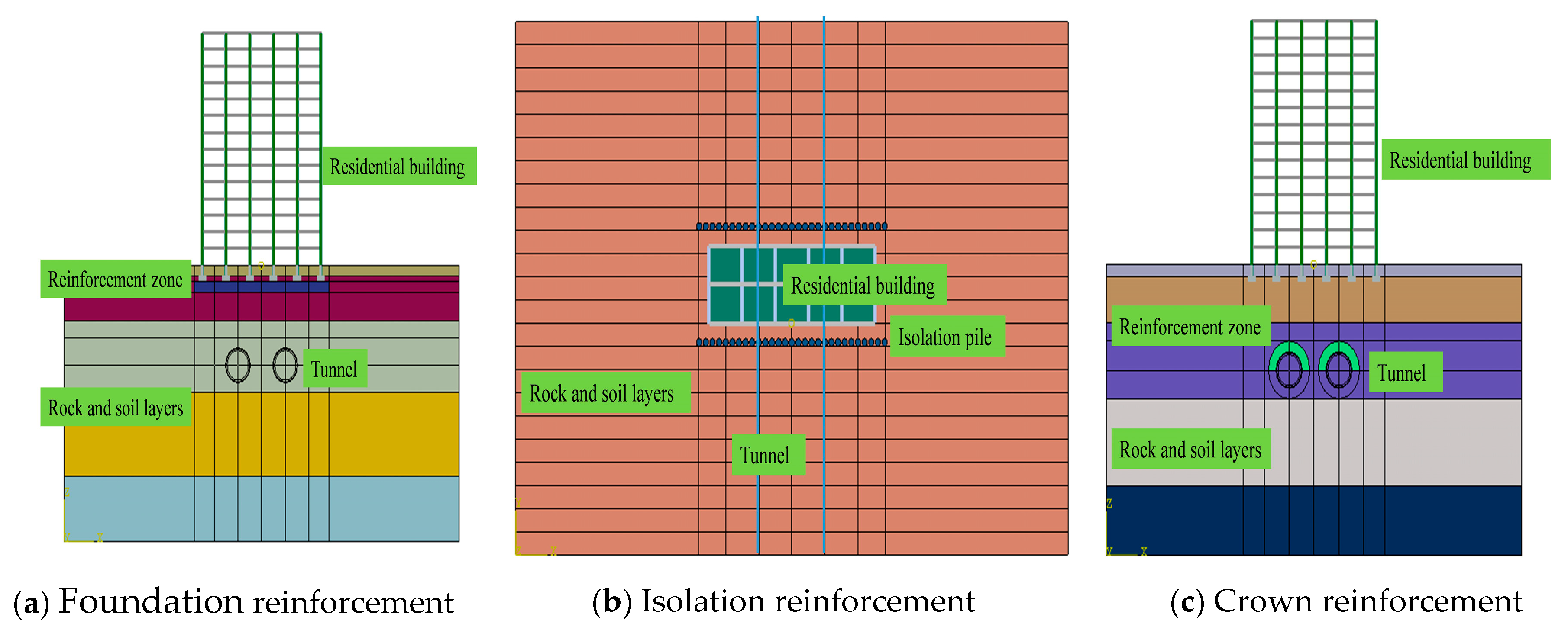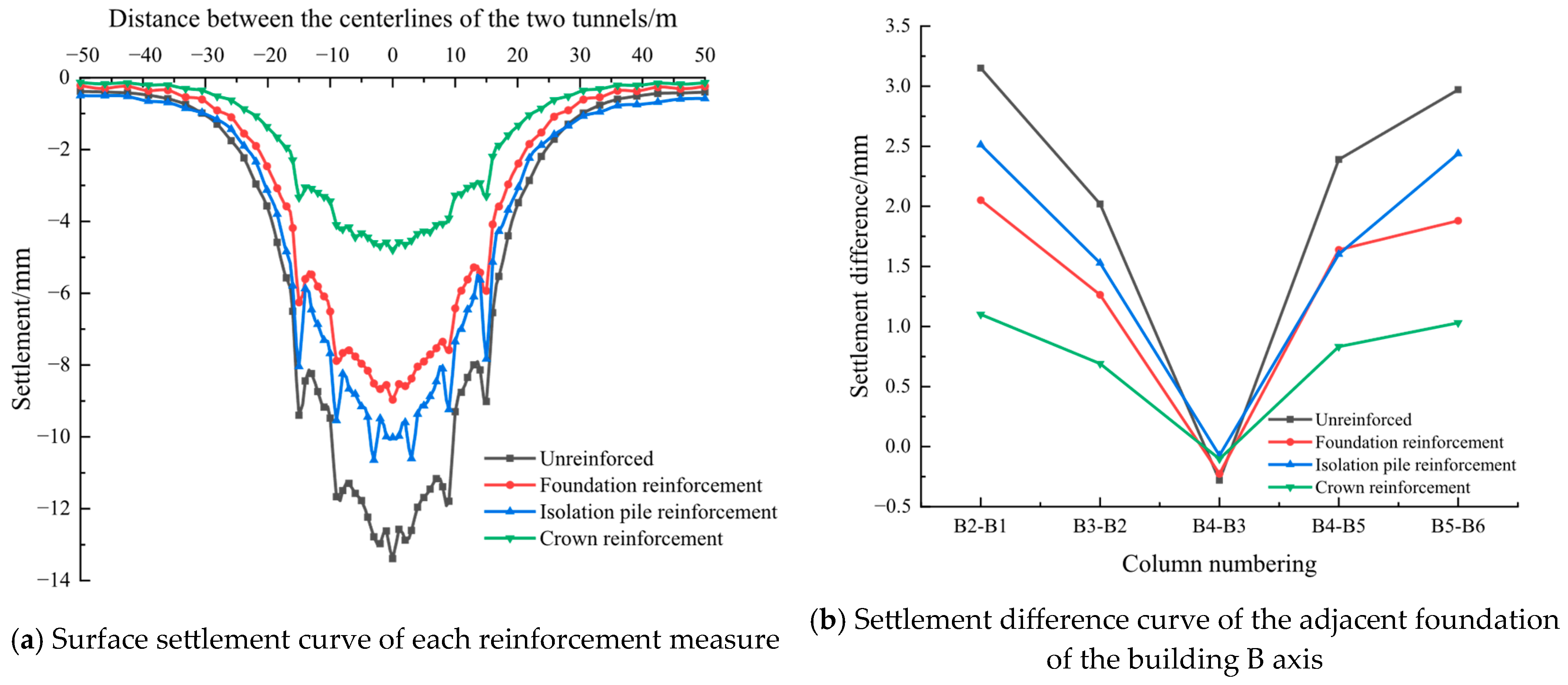 - Reinforcement measures such as grouting beneath the foundation, isolation piles, and crown grouting can all mitigate the structural response to excavation disturbances to varying degrees. Among these, crown grouting is the most effective in controlling settlement magnitude and deformation differences, and is recommended as the preferred method when tunneling directly beneath the building.