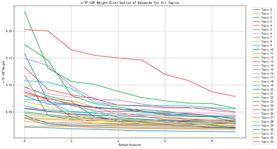 Figure 2 illustrates the declining trend in keyword importance weights within each topic. It shows that for most topics, a few high-ranking keywords carried the greatest representational weight, while the importance of other keywords declined rapidly. This suggests that each topic could be effectively represented by approximately three to five core keywords, with additional keywords providing only marginal improvements in interpretability.