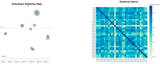To evaluate the accuracy and separability of document clustering, the Davies–Bouldin Index (DBI) was used, a well-established method for internal validation. This index identified the least favorable group pairs by utilizing within-group variance and between-group centroid distances []. The DBI for this model was 0.313, indicating good separation between topic clusters.