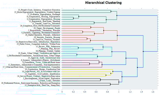 To further understand the relationships among identified topics, the study conducted visual analyses using a topic distance map and a cosine similarity heatmap. These tools helped to uncover the latent structure of urban renewal policy discourse. Figure 3 presents a 2D topic distance map alongside a cosine similarity heatmap; Figure 4 shows the topic hierarchical clustering diagram. The topic distance map applied dimensionality reduction to project the 34 topics onto a two-dimensional plane. In this map, the size of each circle indicated the relative importance of the topic, and the spatial proximity between circles reflected semantic similarity. The cosine similarity heatmap revealed pairwise semantic correlations among the 34 topics. Darker shades of blue indicated stronger similarity (values closer to 1), while lighter shades represented weaker associations (values closer to 0). The heatmap confirmed the internal coherence of certain topic clusters and the divergence among others. These findings reinforced the reliability of the BERTopic clustering results and validated the natural grouping of topics. Together, these visual analytics revealed the semantic structure underlying China’s urban renewal policy discourse. They demonstrated the systematic and hierarchical nature of policy formulation, offering insights into how thematic priorities evolved and interconnected within the broader urban governance framework.