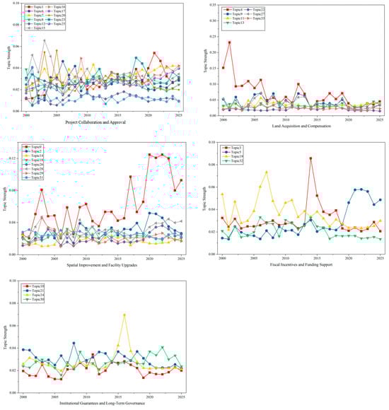 To further explore the evolution of the thematic intensity of urban renewal policies in China, this study conducted an evolutionary analysis of the topics generated by the BERTopic model. The data were sliced by year to show the evolution of five key policy themes in urban renewal over the past 25 years. This allowed for a clearer understanding of the changing trends in thematic intensity and government focus. The topic strength distribution of urban renewal policies over the years is shown in Table 3, and the trends were analyzed through the thematic intensity trend line (Figure 5).