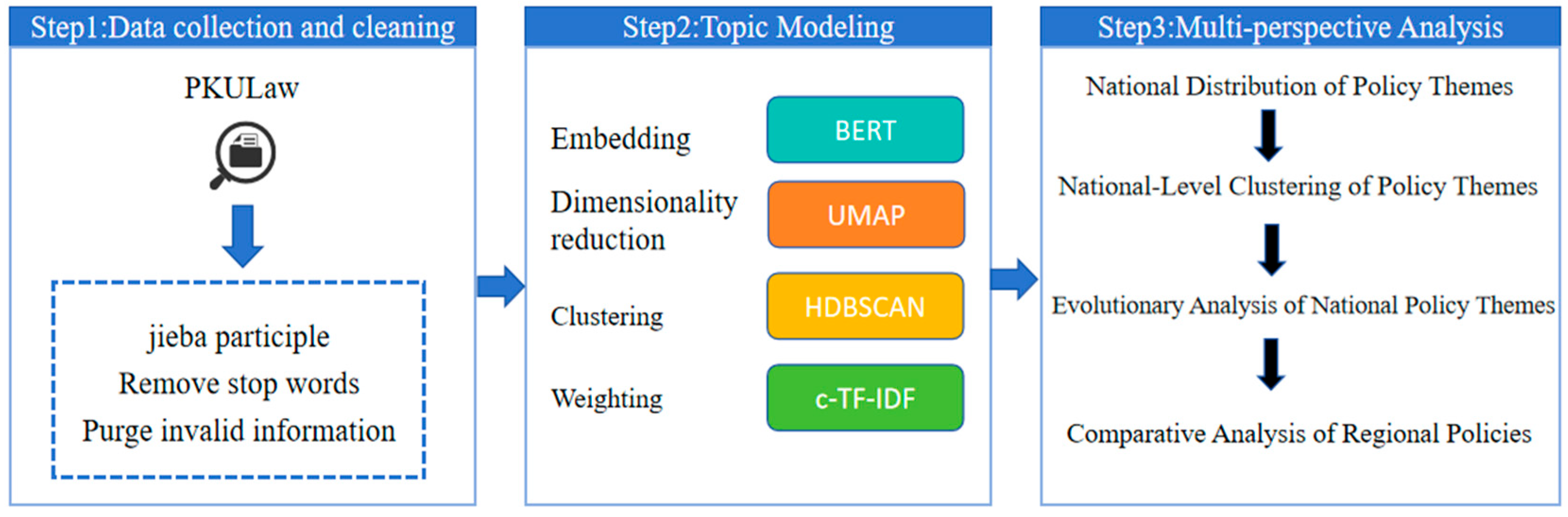 This study performs topic identification and evolutionary analysis on urban renewal policy texts in China. The research steps for this study are shown in