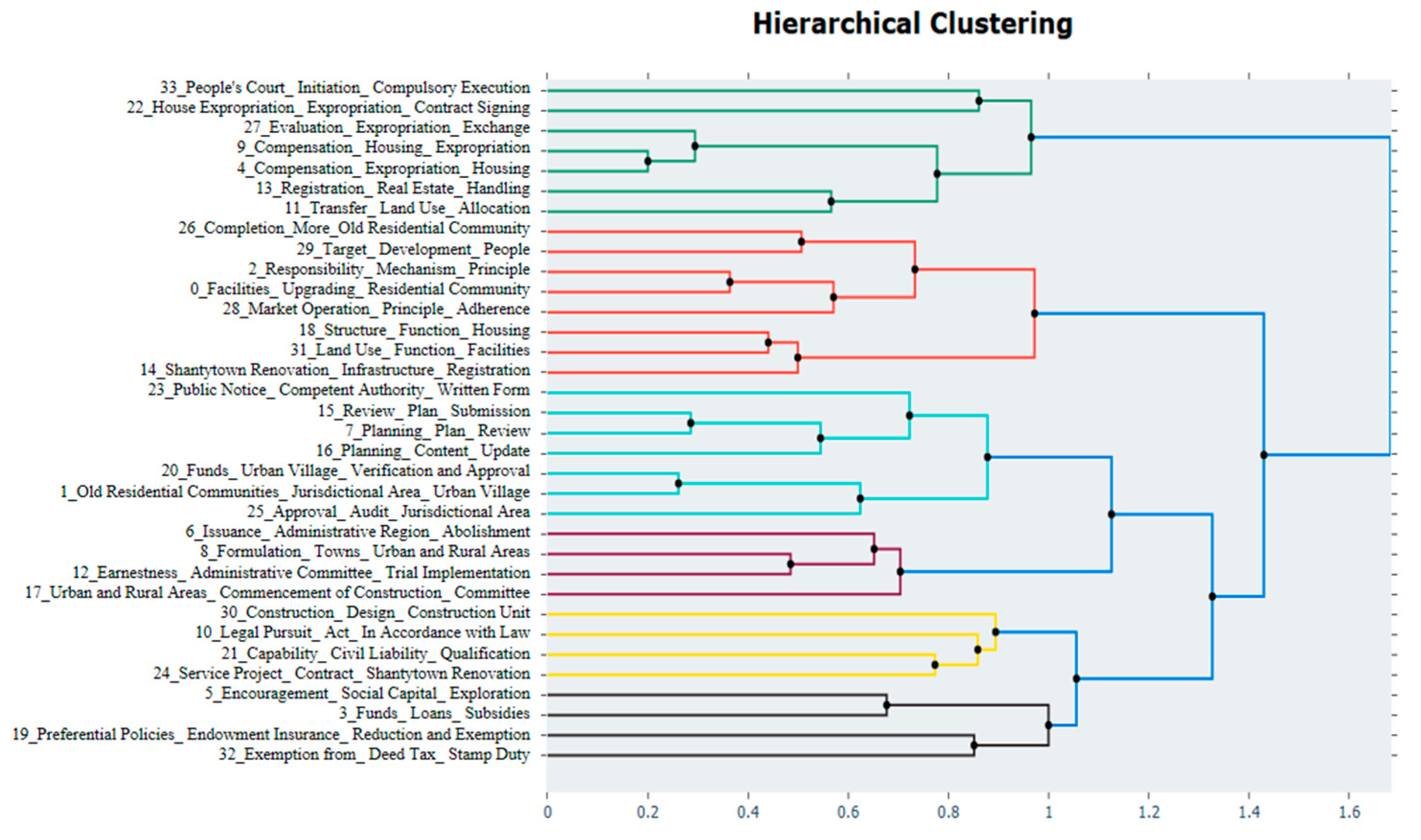Based on the clustering results, evaluation metrics, and expert judgment, this study categorizes the 34 topics into five overarching dimensions: Spatial Improvement and Facility Upgrades, Project Collaboration and Approval, Land Acquisition and Compensation, Fiscal Incentives and Funding Support, and Institutional Guarantees and Long-term Governance.