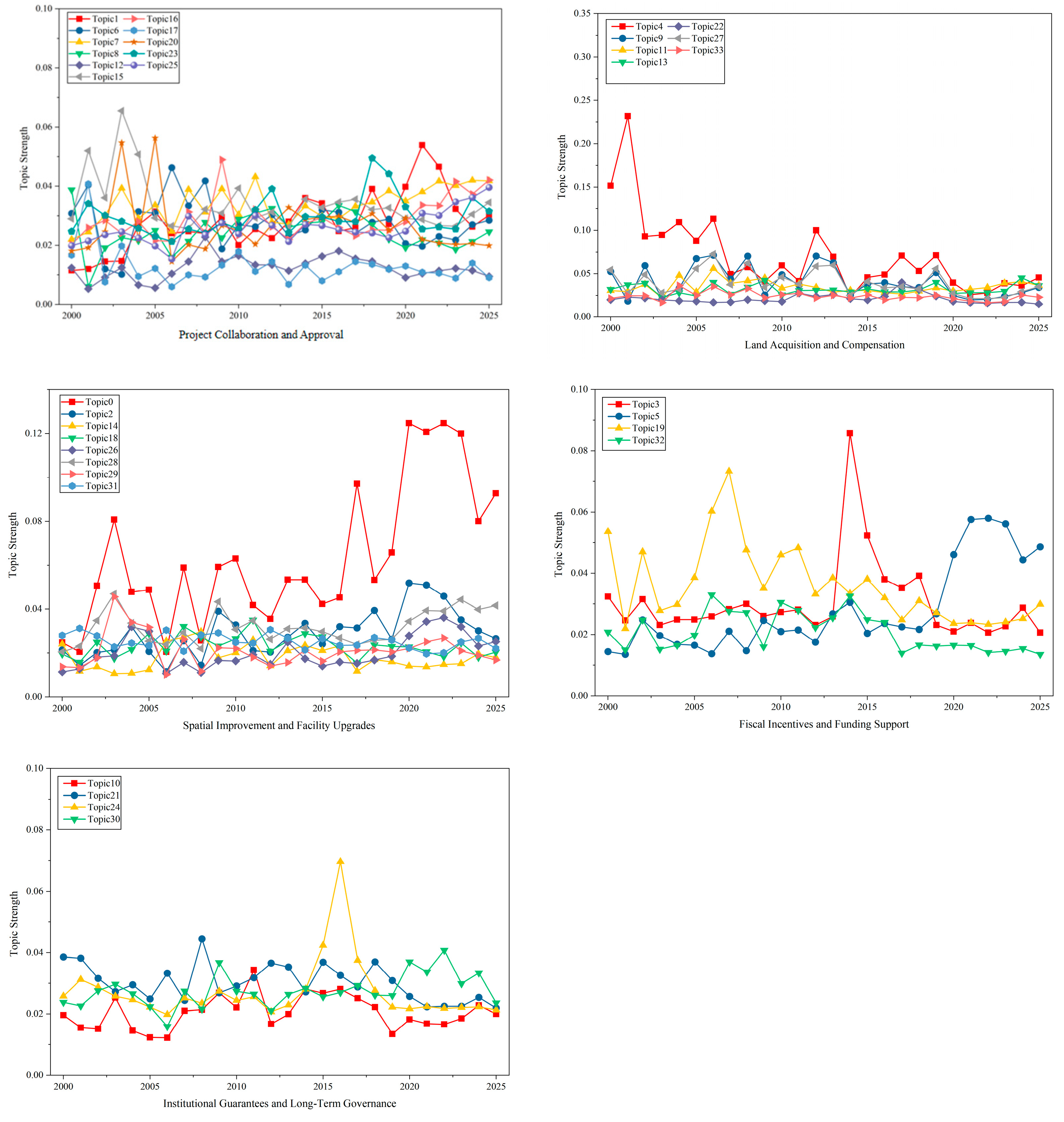 4. Fiscal Incentives and Funding Support: This reveals the evolution of financing mechanisms in China’s urban renewal. Around 2014, central government interventions such as monetary compensation in shantytown redevelopment and policy bank loans led to increased attention on lending (Topic 3). After 2020, policy encouraged private investment (Topic 5), reflecting a shift toward market-driven and sustainable renewal models. This trend aligns with broader market reforms and modernized governance, though challenges remain in balancing policy incentives with fiscal sustainability.