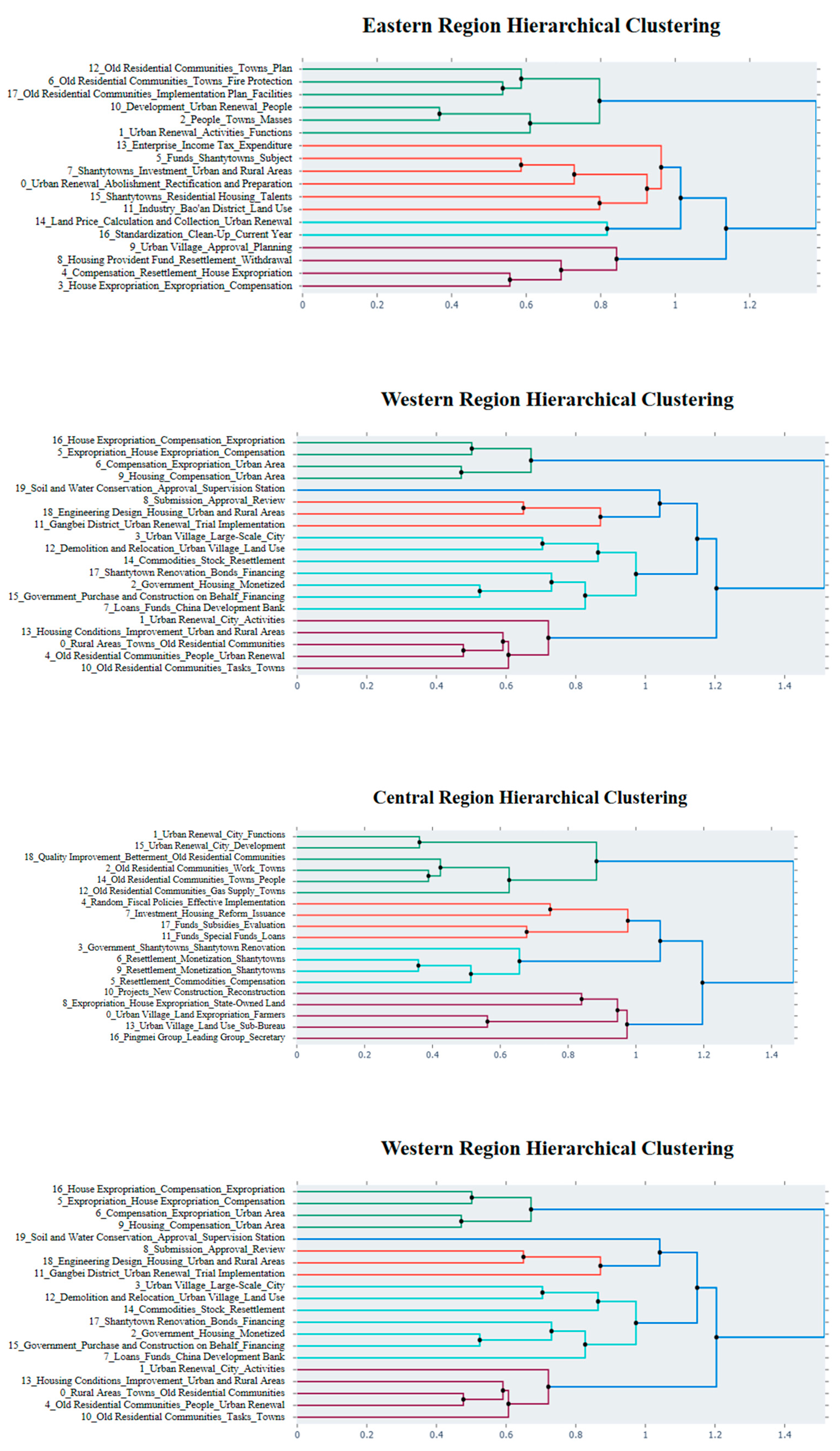 Through a comparative analysis of the urban renewal policy themes across the four regions, the following common features emerge: (1) Land Acquisition and Resettlement Compensation: All four regions have clear policy themes surrounding land acquisition and resettlement compensation, reflecting the collaborative nature of the policies. In the Eastern region, topics like Topic 3 and Topic 4 emphasize land requisition and resettlement, while in the Western region, Topic 5 and Topic 6 focus on compensation and relocation. In the Central region, Topic 0 and Topic 8 highlight similar themes, and in the Northeastern region, Topic 4 and Topic 7 also reflect the land acquisition and resettlement paradigm. This indicates that all regions focus on standardizing the requisition process to ensure smooth integration of resources and protect the rights of affected groups. (2) Funding Support and Financing Innovation: Each region proposes various financial and fiscal support mechanisms to address the funding needs of urban renewal projects. In the Eastern region, Topic 5 and Topic 7 involve resettlement investment and subsidies, while in the Western region, Topic 7 and Topic 17 mention special loans and bond financing. The Central region’s Topic 11 and Topic 17 emphasize special funds and evaluation mechanisms, while the Northeastern region’s Topic 3 addresses monetization and financial arrangements. Despite the varying economic strengths across the regions, all have been actively exploring diverse funding paths and improving funding assurance mechanisms. (3) Facility Improvement and Quality Upgrades: This reflects the high priority placed on improving living conditions and responding to public demands. In the Eastern region, Topic 6 and Topic 11 emphasize functional optimization and upgrades to infrastructure like fire safety; in the Western region, Topic 13 stresses improving housing conditions and enhancing the quality of housing. In the Central region, Topic 12 focuses on the gas facilities in old residential areas, which are a critical public service need. In the Northeastern region, Topic 5 shows a clear policy focus on quality upgrades, with a clear goal.