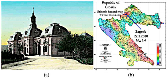 View of the Mirogoj mortuary in the early 20th century and seismic hazard map of Croatia showing the 2020 Zagreb earthquake epicenter with a 475-year return period (b).