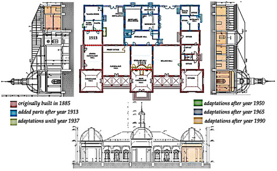 Figure 2 illustrates the original layout of the building constructed in 1886, along with the phases of its extensions and alterations. Three extensions were added to the north side of the original structure. These annexes were planned in 1913 and completed during the 1930s. In 1992, the building was reinforced with semi-prefabricated ribbed reinforced concrete ceilings and robust reinforced concrete beams installed at the attic level of the older section, running east–west. Simultaneously, the wooden roof structure was reconstructed to maintain the original design.