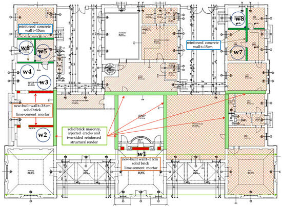 The new brick walls were installed in place of the removed original walls in the older part of the building (Figure 3, walls W1, W2, and W3). These walls were constructed using solid clay bricks measuring 25 × 12 × 6 cm, laid in lime-cement mortar. The thickness of wall W1 is 51 cm, while walls W2 and W3 are 38 cm thick.