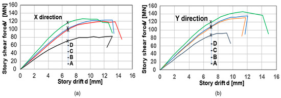 Figure 6 compares the building’s response to earthquake loads in two orthogonal directions (X and Y) using “story shear force–story drift” diagrams for all four states mentioned above. A comparison of curves B and C reveals that limited reinforcement of the walls with reinforced plasters does not significantly improve performance. However, the systematic plastering of all walls (comparison of curves B and D) notably increases the stories’ load capacity in both directions and enhances their ductility in the Y-direction.