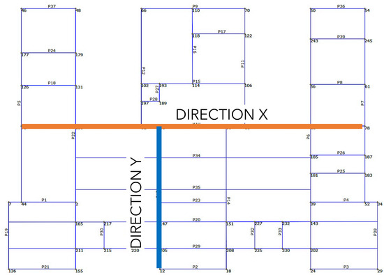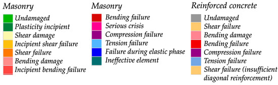 The 3Muri program identifies critical elements and evaluates the risk of global collapse due to damage or collapse of its individual parts. Different performance or damage states during a pushover analysis of wall elements are color-coded. Figure 7 presents the color legend of the types of damage to the structure’s load-bearing elements. Figure 8 presents the location of wall damages presented in Figure 9.
