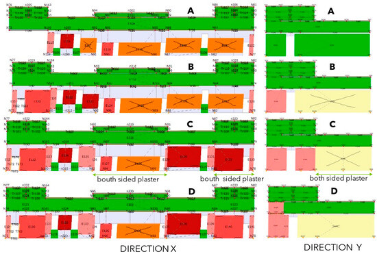 When comparing the wall conditions in Figure 9 and Figure 10, it is important to note that these conditions are observed at the maximum story drift due to maximum story shear force, as presented in Figure 6 above. The cases of strengthening C and B are easier to compare due to the approximately equal values of story drift and shear force. In the X-direction, the impact of the change in the wall response is visible only in the wall on the far east side, where plastering increased its shear strength to such an extent that it failed due to bending. This is because reinforced plaster increases the shear strength more than the bending strength of the wall. The other walls in the X-direction did not change the response mechanism, as in both cases, they experienced the same type of shear damage (initiation of shear failure).