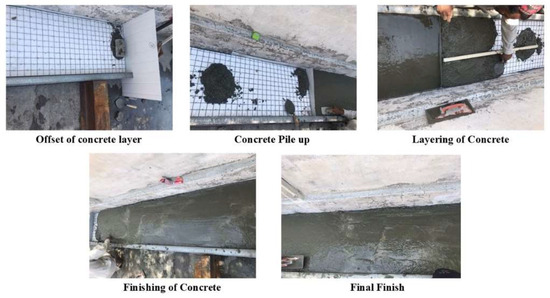 Wire mesh was first positioned in the formwork. To completely cover the wire mesh and shear connectors, the initial layer of concrete was manually applied and spread across the EPS surface. Concrete was applied in layers, beginning with small areas and then spreading uniformly, as can be seen in Figure 3. Before adding more concrete layers, cement slurry was used to improve bonding between layers. To create a level surface and keep a constant thickness throughout the panel, the concrete was manually spread. The surface was rigorously finished with trowels to produce a smooth and even finish after the top layer was applied and leveled.