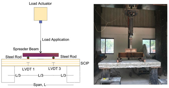 Four-point bending tests were performed as part of the testing process in accordance with ASTM E72 standards [47]. As shown in Figure 4, these tests entailed applying a transverse out-of-plane force on slab panels. A load actuator, a spreader beam, steel rods for support, and linear variable displacement transducers (LVDTs) for measuring deflection made up the testing apparatus. Through a spreader beam, which uniformly distributed the supplied force, the load actuator applied a vertical load at the SCIP’s midspan. To ensure a pinned-ended condition and allow for unfettered rotation, the specimen was only held by two steel rods.