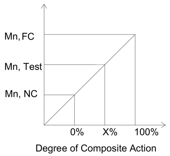 The degree of composite action, KMn, in the tested SCIP can be determined using Equation (6). It combines three essential elements that can be used to determine the degree of composite action in SCIP: the real moment, which is acquired from either experimental data () or a prediction model, the theoretical fully composite moment, and the theoretical non-composite moment [21].