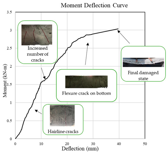 The flexural behavior of SCIP-3, which includes #3 reinforcement bars spaced at 112 mm in the bottom wythe, was evaluated through a four-point bending test. The moment–deflection curve of SCIP-3 (Figure 7) highlights the structural response of the panel under increasing loads. The initial linear portion of the curve indicates elastic behavior, reflecting the stiffness of the panel. The higher slope of the curve in this region suggests a stiffer response compared to SCIP-2, which can be attributed to the closer reinforcement spacing in the bottom wythe.
