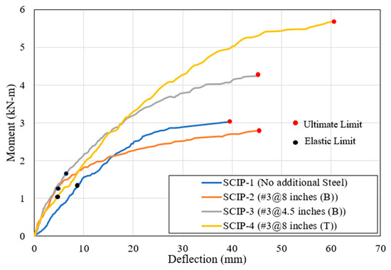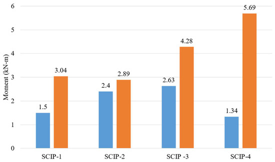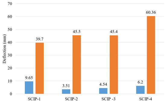 In terms of ductility, SCIP-2 exhibited a more gradual failure process compared to the brittle-like failure of SCIP-1. This enhanced ductility, provided by the reinforcement, indicates a resilient design capable of withstanding higher loads and deformations before ultimate failure. The moment–deflection Figure 7 data further support this, with SCIP-2 achieving a higher overall load-bearing capacity and a more controlled, predictable failure pattern.