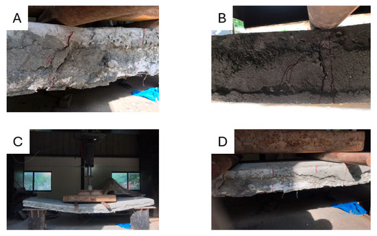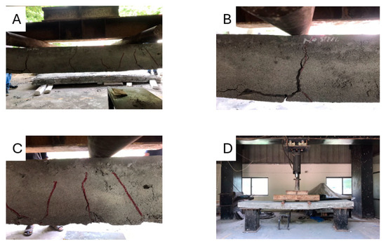 Photographs taken during and after the test Figure 8A–D highlight the formation of flexural cracks, which predominantly appeared in the bottom regions of the panel, near the tension face, and propagated upwards toward the neutral axis. These flexural cracks are parallel to the bending moment, indicative of flexural stress as the dominant failure mechanism. The cracks appeared to be more pronounced near the areas of maximum moment, between the point loads.