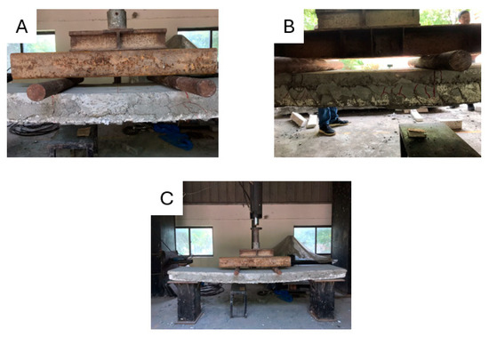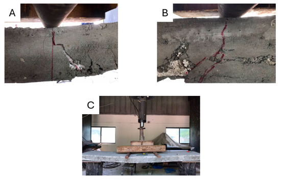 SCIP-3 (A) Close-up view of a significant shear crack at the point of applied load, highlighting the brittle failure in the concrete. (B) Detail of crack propagation and material breakdown along the shear plane. (C) Experimental setup for testing the beam under concentrated load to assess shear and flexural performance.