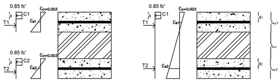 The ultimate moment of a non-composite SCIP (), which represents its maximum bending capacity, can be determined by adding together the ultimate moments of each of its individual layers, or wythes. These formulas are grounded in the principle of strain compatibility, which ensures that each component of the panel deforms uniformly under stress. It is important to note that there might be slight variations in these calculations, as indicated by Olsen and colleagues in their 2017 study [21]. This approach provides a comprehensive and accurate method for assessing the structural capacity of such panels: