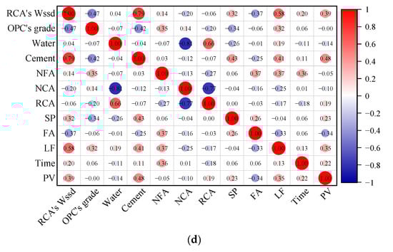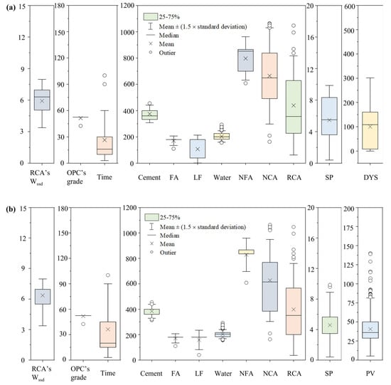 As a result, 380 sets of RCAC mixtures were collected from 13 studies [5,23,24,25,26,27,28,29,30,31,32,33,34], where 11 input features include the RCA’s Wssd (%), OPC’s grade (MPa), water content (kg/m3), cement content (kg/m3), FA content (kg/m3), LF content (kg/m3), natural fine aggregate (NFA) content (kg/m3), natural coarse aggregate (NCA) content (kg/m3), RCA content (kg/m3), SP content (kg/m3), and measurement time (min). For clarity, the w/b or water-to-cement (w/c) ratios were replaced by water content. The mass of RCA was converted to that of total-dried RCA. If RCA was pre-absorbed, the absorbed water was subtracted from RCA content and added to water content. Moreover, DYS and PV were derived from flow curve tests. Since some studies did not specify the rheological testing environment, while others explicitly conducted tests at room temperature, the testing environment of these 13 studies was defined as room temperature. Furthermore, since FA reacts minimally over the whole rheological testing period (within 100 min in this study), all fly ashes were generalized, so that they only behaved as fine spherical particles in the rheological process. Additionally, due to the diverse parameters of polycarboxylate-based SPs, SPs are often not subdivided in machine learning studies on concrete performance prediction [18].