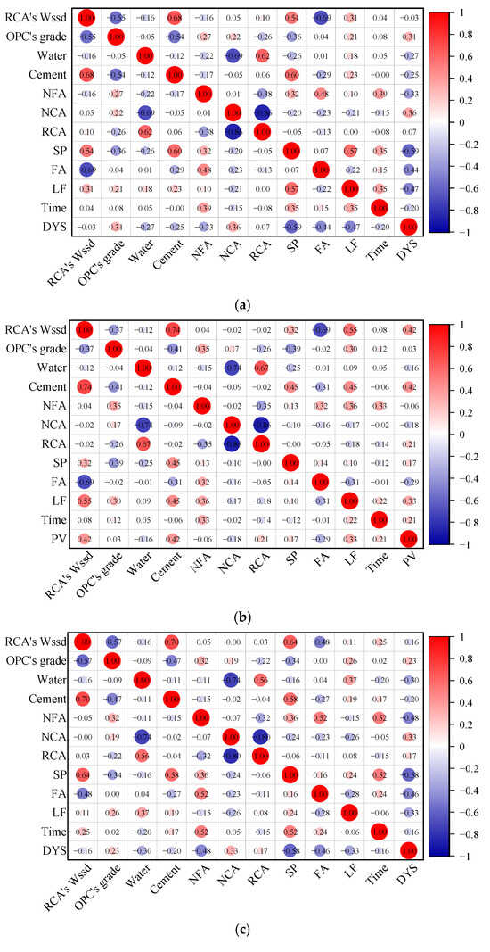 In summary, the correlation analysis highlights the multifaceted influences of input parameters on RCAC’s rheological properties. DYS is dominantly controlled by SP content, while PV is more sensitive to RCA’s Wssd and cement content. It should be noted that these correlations are limited in capturing complex, non-linear interactions and lack predictive capabilities. Hence, machine learning models are necessary to address these gaps.