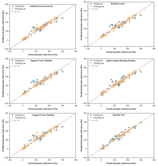After determining the optimal hyperparameters for each machine learning algorithm, the predictive performance of the models for DYS was assessed using training and testing datasets. The evaluation metrics of six machine learning models toward different datasets, including R2, RMSE, and MAE, are detailed in Table 4. Figure 3 visualizes the above results. As shown, the X-axis represents the experimentally measured values of DYS, while the Y-axis denotes the values predicted by the models. The diagonal line in the figure represents the ideal scenario where the predicted values perfectly match the experimental results.