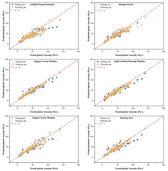 After determining the optimal hyperparameters for each machine learning algorithm, the performance and predictive accuracy of machine learning models in estimating PV for RCAC are also evaluated using training and testing datasets. The evaluation metrics of six machine learning models toward different datasets, including R2, RMSE, and MAE, are detailed in Table 5. Figure 4 visualizes the above results. The X-axis represents the experimentally measured values of PV, while the Y-axis denotes the values predicted by the models. Similarly, the diagonal line in the figure represents the ideal scenario where the predicted values perfectly match the experimental results.