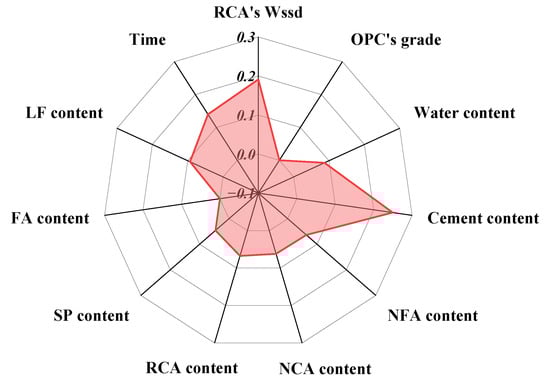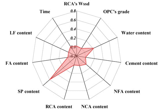 The RCA’s Wssd ranked second (importance score: 0.19124), emphasizing its critical role in determining effective water availability within the mix. RCA’s high Wssd leads to increased water absorption during mixing, reducing free water for lubrication and thus raising the viscosity of the cementitious matrix. This effect is particularly pronounced in RCAC, where RCA is known to exacerbate water demand due to its porosity and adhered old mortar. The high importance of Wssd reflects its indirect yet significant impact on PV through its influence on the paste’s consistency and lubrication capacity.
