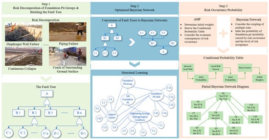 The risk assessment process is shown in Figure 1. In step 1, the process begins with FTA to identify and categorize critical risk events—such as diaphragm wall failure, piping damage, progressive collapse, and ground surface cracking—and to construct a fault tree that clarifies the logical relationships among top events, intermediate events, and basic events. In step 2, the fault tree is transformed into a BN structure, which is further optimized via structure learning to form a directed acyclic graph capable of representing multi-risk coupling interactions. In the final step, the AHP is employed to determine the prior probabilities of risk events and conditional probability tables (CPTs) within the BN. The resulting BN supports probabilistic inference under multi-risk scenarios, enabling not only the estimation of the probability of DFPC instability but also the evaluation of risk acceptability levels. This framework provides a systematic, dynamic, and probabilistic-consequential approach to risk assessment, significantly reducing the subjectivity associated with expert judgment.