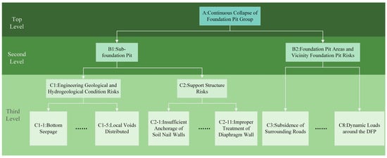Structured FTA allows for a comprehensive assessment of risks at multiple levels to ensure a better understanding and mitigation of potential hazards within DFPCs. The three-level structure of FTA is described in Figure 2. The detailed hierarchy for each level is shown in Table 1. The third level is subdivided into subfoundation pit risk and foundation pit area risk. These risks are further divided into fundamental risks, which are listed in Table 1.