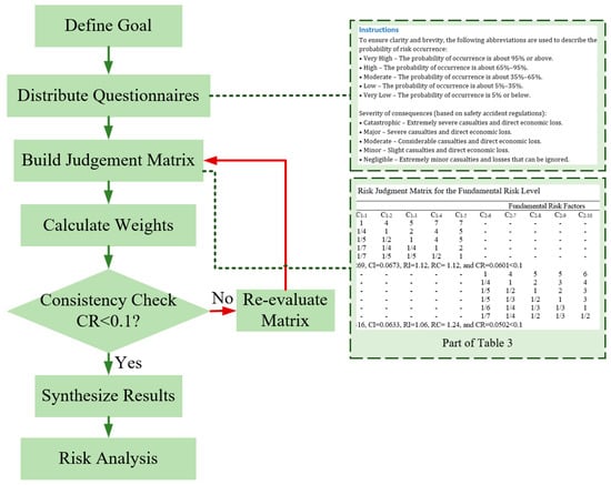 The AHP was applied to process the collected data and ultimately determine the likelihood that each risk event would affect the stability of the foundation pit. Table 3 presents the judgment matrices Aij at the three hierarchical levels of the fault tree and the evaluation indices. The risk judgment matrix Aij was determined via expert evaluations derived from structured survey questionnaires. The eigenvector associated with the maximum eigenvalue λmax of each judgment matrix Aij was calculated via Equations (2)–(4), whereas the maximum eigenvalue was computed via Equation (5). Subsequently, consistency checks were systematically performed on all the matrices to ensure analytical rigor. In Equation (6), CI represents the consistency index and n represents the order of matrix Aij. In Equation (7), RC represents the random consistency index, and the value is determined by the order of the reciprocal inverse judgment matrix Aij. Empirical studies indicate that a CR value less than 0.10 is acceptable []. Figure 4 illustrates the main steps of the AHP method.
