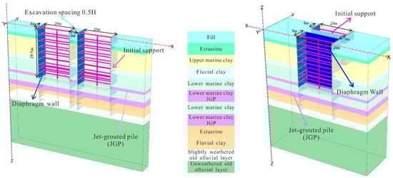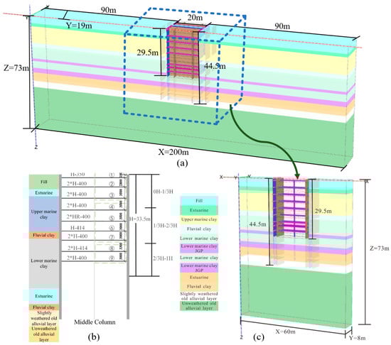 In 2004, the C824 section of the Nicoll Highway Circle Line in Singapore collapsed during excavation because of the failure of the approximately 100 m long foundation pit support system. The foundation pit in the C824 section was approximately 20 m wide, with an excavation depth of H = 33.5 m. This foundation pit employed 0.8 m thick diaphragm walls, each spanning 6 m in width, with the wall toes extending 3 m into hard soil layers. This DFP provided the parameters to develop the simulation model. In Figure 5a, the geometric dimensions of the model were 60 × 8 × 73 m in the x, y, and z directions, respectively, with an excavation depth of 29.5 m. The lateral extents of the numerical model were set to three times the excavation dimension in each direction, in strict accordance with the widely accepted empirical rule in geotechnical numerical simulation []. For clarity of visualization in the figures, only a representative portion of the model near the excavation is displayed in the paper.