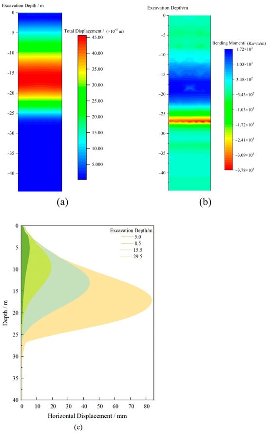 Mechanical indicators of the diaphragm wall: (a) contour maps of horizontal displacement, (b) contour maps of bending moments, and (c) horizontal displacement of diaphragm walls at various stages of excavation.
