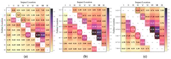 To systematically investigate the effect of support failure on DFP stability, this study categorized support systems into 24 distinct scenarios on the basis of predefined failure patterns. These scenarios are classified into three distinct failure patterns: failure of a single support, concurrent failure of two adjacent supports, and simultaneous failure of three consecutive supports. The red circle indicates the variation in axial force of adjacent supports. The green circle denotes the rates of change in the safety factor of the supports in comparison to other locations. For the failures of a single support, a pair of adjacent supports, and three adjacent supports, the rates of change in the safety factors for the remaining supports are shown in Figure 7a, where the X axis represents the rate of change in the safety factor for the remaining supports after a specific support fails and the Y axis represents the failure location. For example, in Figure 7a, when the sixth single support fails, the rate of change in the safety factors for the adjacent lower support reaches 43.08%. This value is approximately twice that of the adjacent upper support, which is 22.83%. These findings indicate that the lower adjacent support bears most of the load released by the failed support. Similarly, the same situation can be observed in Figure 7b,c for the groups of supports involving the failure of the sixth support.