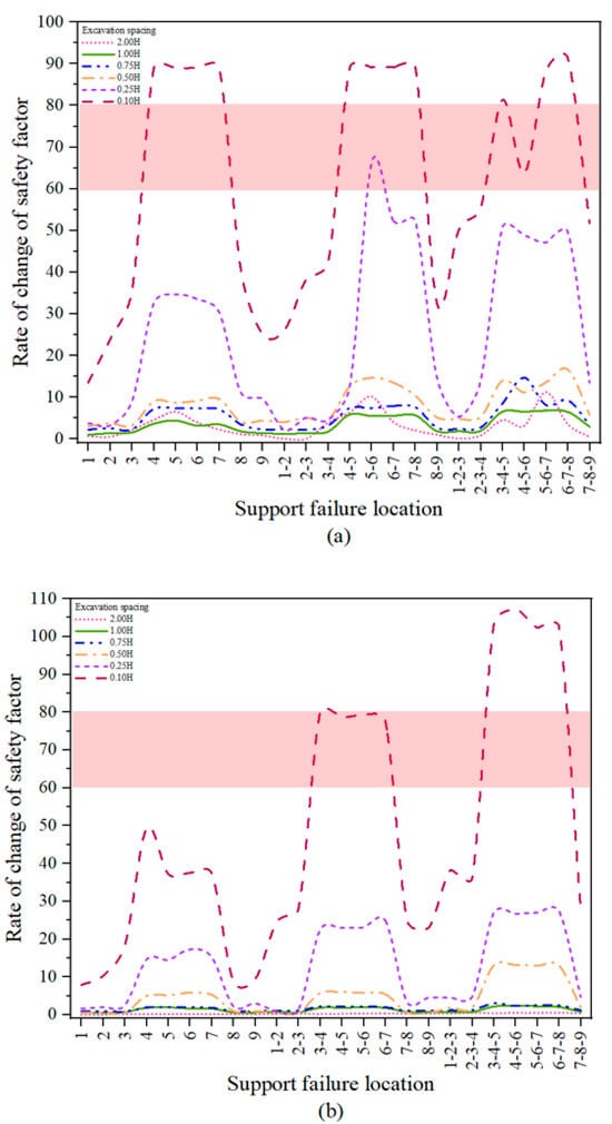 In this this study, the effects of support failures within subfoundation pits coupled with each of the other risk factors on the supports near the pit were examined. As shown in Figure 9, the rate of change in the safety factors for nearby pits in both layouts gradually increases as the pit spacing decreases. Figure 9 shows that support failure scenarios ①–③ induce significantly greater deterioration in adjacent excavation safety factors—with an impact that is at least 40% greater—than failure cases ④–⑨ do. As shown Figure 9b, middle support failures generate stepwise progression of safety factor variations, confirming that increasing the number of failures amplifies interexcavation effects. Per the Technical Code for Monitoring of Building Foundation Excavation Engineering (GB 50497-2015), early warning protocols must be activated when support axial forces reach 60–80% of the design capacity, which is indicated by the red shaded zone in Figure 9. Immediate mitigation measures are required when parameters enter or exceed this critical threshold.