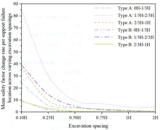 Mean rate of change in the safety factor per support failure location across varying excavation spacings.