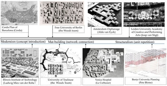 The Team 10 group first introduced the concept of mat-building into post-war university campus planning, laying the theoretical foundation for grid-type campus spatial organization. Through a historical review of mat-building development, Alison Smithson precisely defined its conceptual connotations, offering significant theoretical support for its classification system and design methodologies []. Tom Avermaete further explored the stem-cluster-network urban architectural model proposed by Candilis-Josic-Woods, highlighting its notable influence on the development of mat-building and grid-type spatial layouts in post-war architectural practice [].
