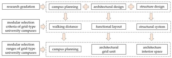 This study focused on the modular system of grid-type university campuses. Regarding master planning, the study examined the relationship between module scale and pedestrian walking distances, analyzing how module selection optimizes spatial accessibility and promotes disciplinary integration and interaction. As for architectural design, it explored how module scale accommodates functional layout rationality and spatial organization flexibility. In terms of the structural system, it investigated the implementation of modular systems in structural frameworks, column grid arrangements, and standardized construction systems. Through this research framework, the study offers a systematic review and analysis of modular systems in grid-type university campuses (Figure 3).